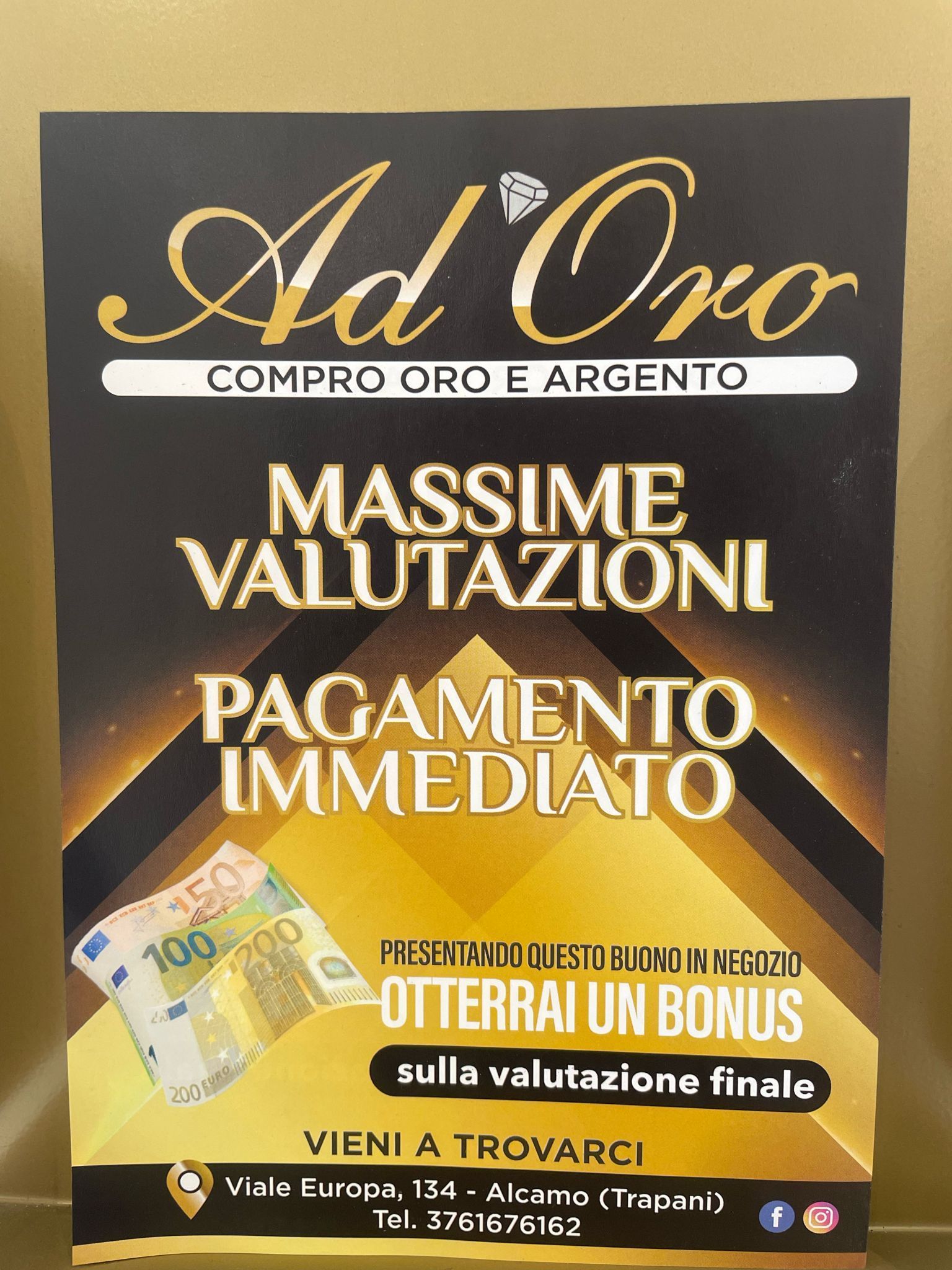 Approfitta della nostra esclusiva promozione! Se presenti il volantino in negozio, ti verrà applicato un bonus extra sulla valutazione finale dei tuoi preziosi. Con Ad'Oro Compro Oro e Argento ad Alcamo, garantiamo massime valutazioni e pagamento immediato, sempre. Non perdere questa opportunità vantaggiosa per ottenere il miglior prezzo per il ritiro del tuo Oro e Argento, dei tuoi gioielli usati, monete in Oro e lingotti in oro e argento. Affidati alla nostra professionalità e competenza per una valutazione onesta e trasparente dei tuoi beni preziosi.